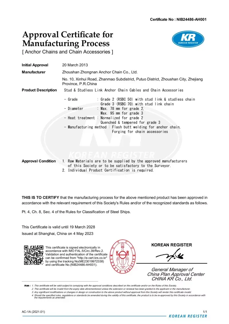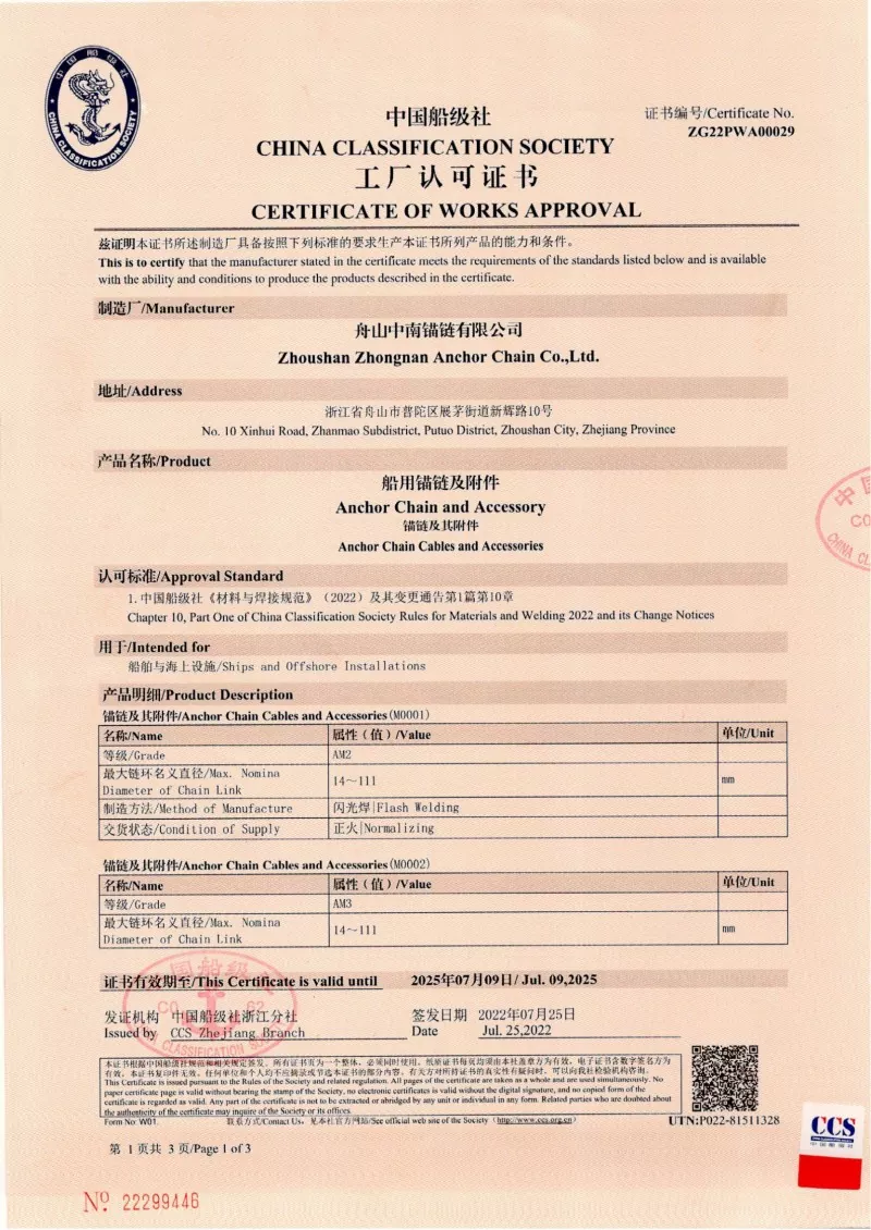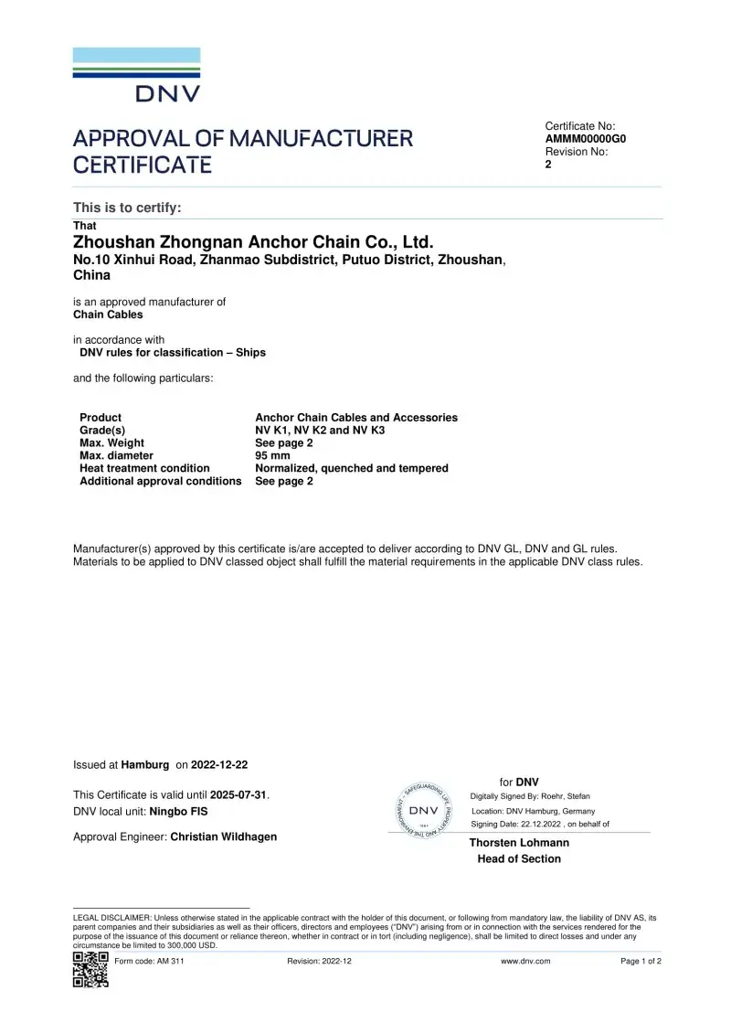 هر زنجیره لنگر از کارخانه ما مورد آزمایش قرار می گیرد و توسط جوامع طبقه بندی اصلی به منظور کسب اعتماد در مقیاس جهانی تأیید می شود. استانداردهای دقیق ایمنی و عملکرد تجهیزات دریایی توسط مصوباتی که می توانیم از CCS ، ABS ، DNV ، LR ، BV ، NK ، Rina ، KR و Rs ارائه دهیم ، پوشانده شده است.