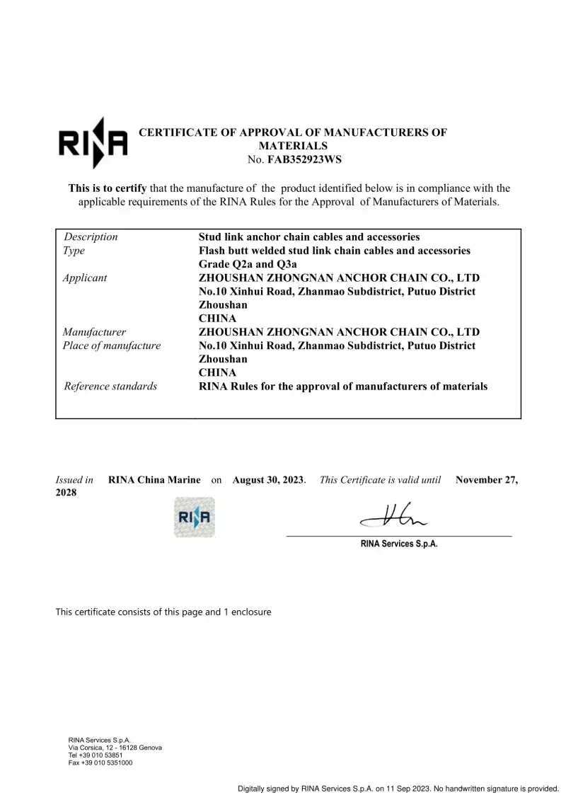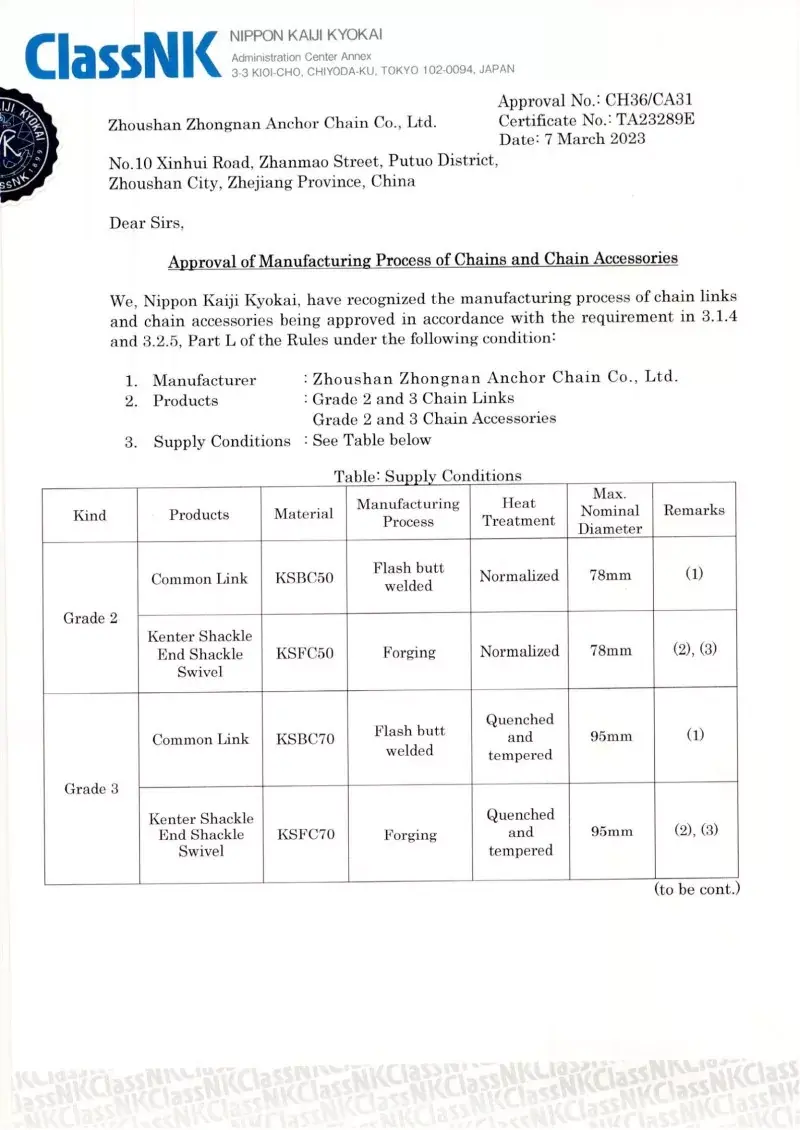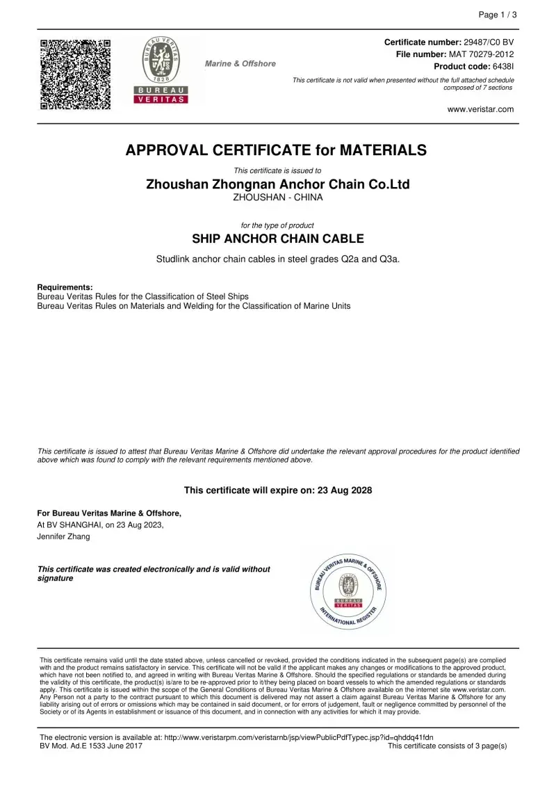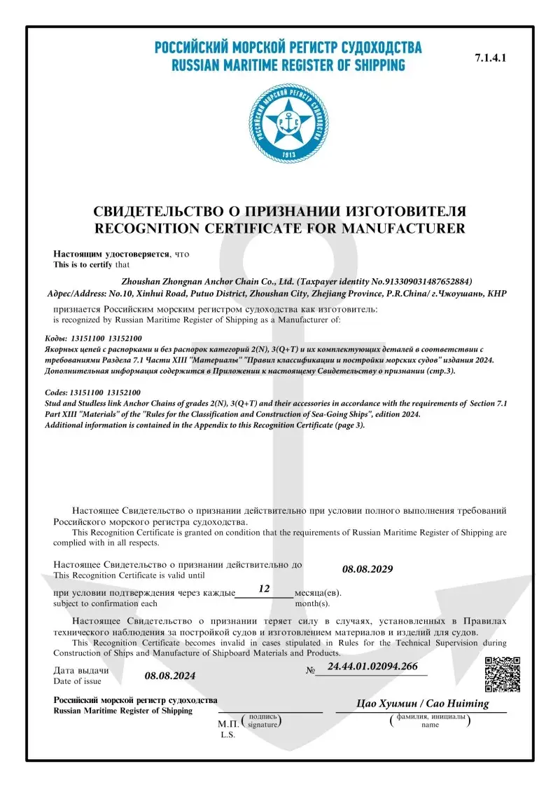 هر زنجیره لنگر از کارخانه ما مورد آزمایش قرار می گیرد و توسط جوامع طبقه بندی اصلی به منظور کسب اعتماد در مقیاس جهانی تأیید می شود. استانداردهای دقیق ایمنی و عملکرد تجهیزات دریایی توسط مصوباتی که می توانیم از CCS ، ABS ، DNV ، LR ، BV ، NK ، Rina ، KR و Rs ارائه دهیم ، پوشانده شده است.